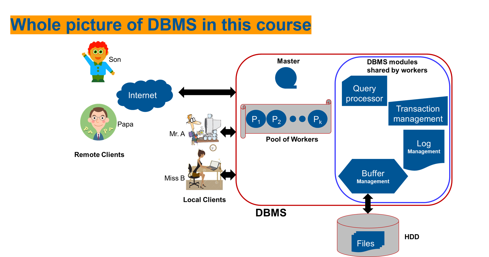 As one of the 3 classical courses in CS (the other twoo are Compiler and OS), many classic courses have been proposed arround the world. My course trys to demonstrate the related topcis in an intuitive way, and also adopt advanced topics so as to cover the latest progresses in Big Data and Data Analytics etc. There are two parts in this course: