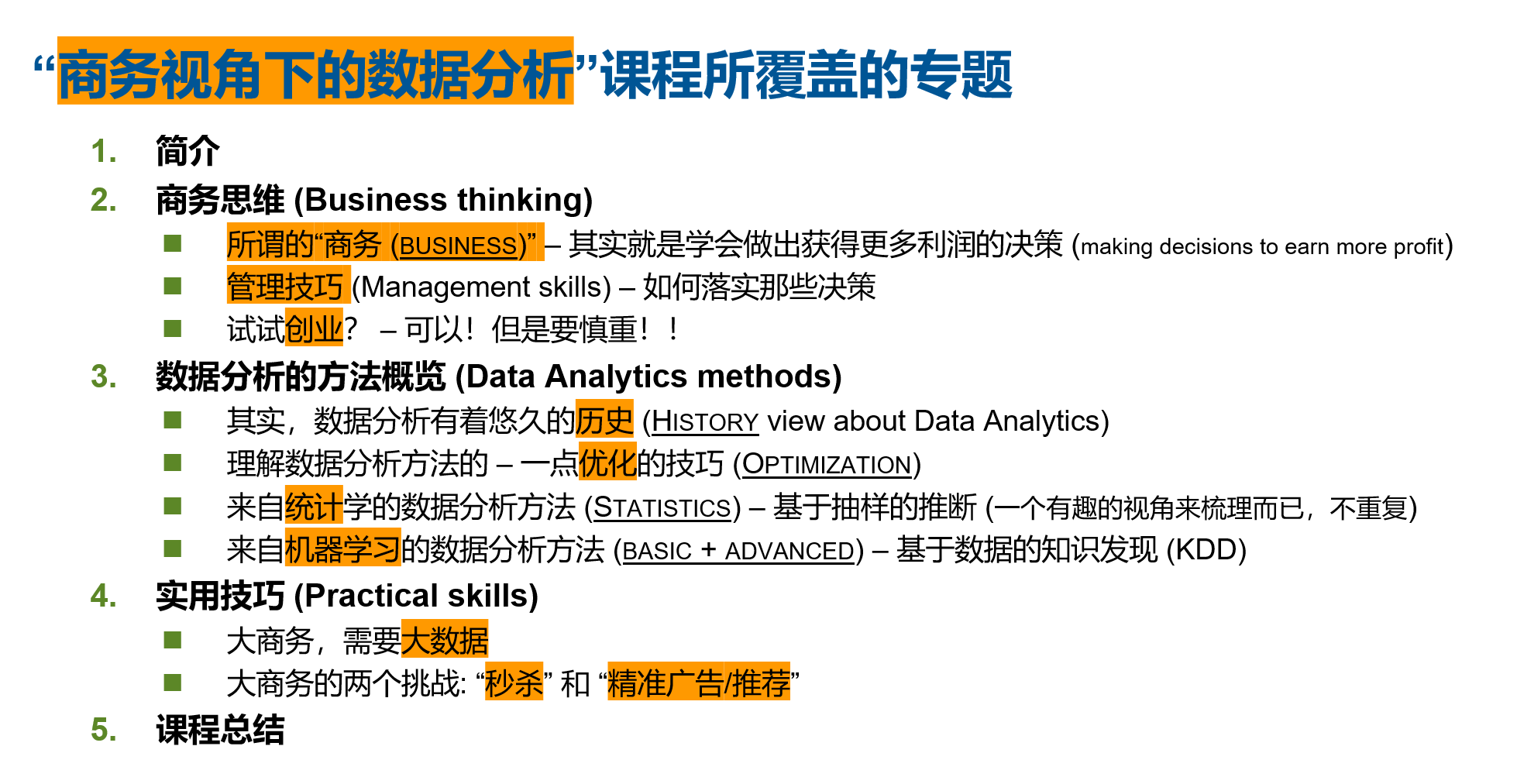 With the explosion of Deep Learning, AI(Artifacial Intelligence), ML (Machine Learning) and Deep Learning etc. are becoming more and more hot in recent years. This course tries to cover those related topics in an interesting way which adopts the business thinking as the framework. To do so, this course provides a big picture as follows:
