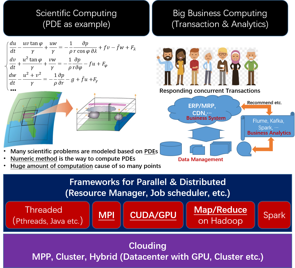 To some extent, the endeavour to pursue more powerful computing capability is all over the history of our humankind. With the invention of computers, many more different computing architectures are proposed besides the famous von Neumann architecture, which are triggered by large scale data computing like HPC and Big Data etc. It's definitely a MUST course for CS students to know/understand/master the related topics in a whole picture way. To do so, this course provides a big picture as follows in three parts: